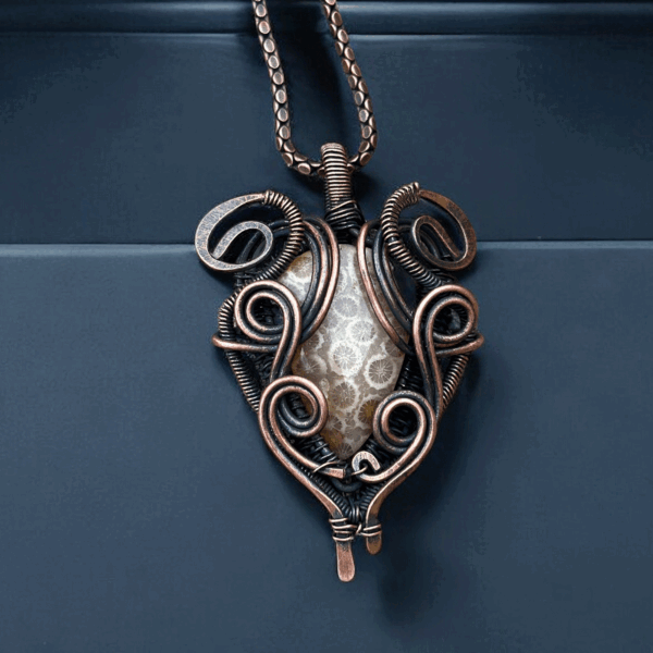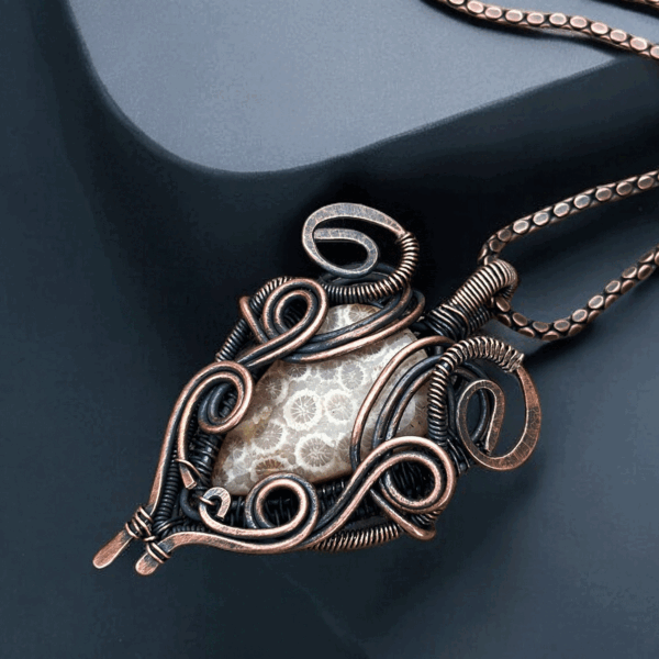 Fossil coral is not just a beautiful gemstone; it holds millions of years of history and geological wonder. Each stone is formed from ancient coral that has undergone a natural process of mineral replacement, creating intricate patterns unique to every piece. Symbolically, fossil coral is believed to inspire emotional balance and promote inner peace, making it much more than a simple accessory—it’s a meaningful talisman for everyday wear. When paired with the warm hues of the copper setting, this pendant transforms into a one-of-a-kind conversation starter and a true keepsake.