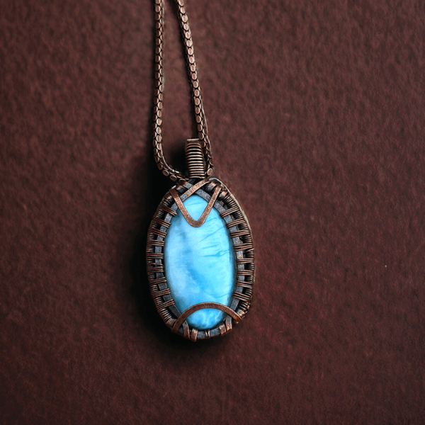 Larimar is a rare blue variety of the silicate mineral pectolite, found only in the Dominican Republic. Its stunning blue color, reminiscent of the Caribbean Sea, ranges from light sky blue to deep volcanic blue. This gem is believed to have calming properties, making larimar copper pendant jewelry not only a fashion statement but also a source of tranquility and peace.