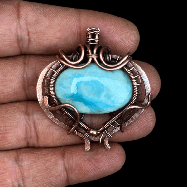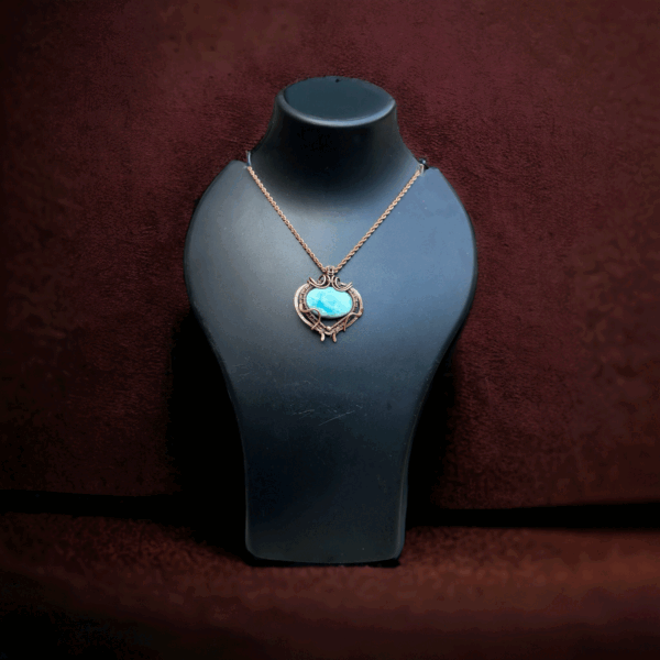 Copper has been used in jewelry-making for centuries due to its durability and warm, rich color. When paired with the enchanting Larimar stone, the copper setting enhances the stone’s natural beauty while providing a sturdy and stylish frame. The combination of these two materials results in a pendant that is both elegant and robust, perfect for everyday wear or special occasions.